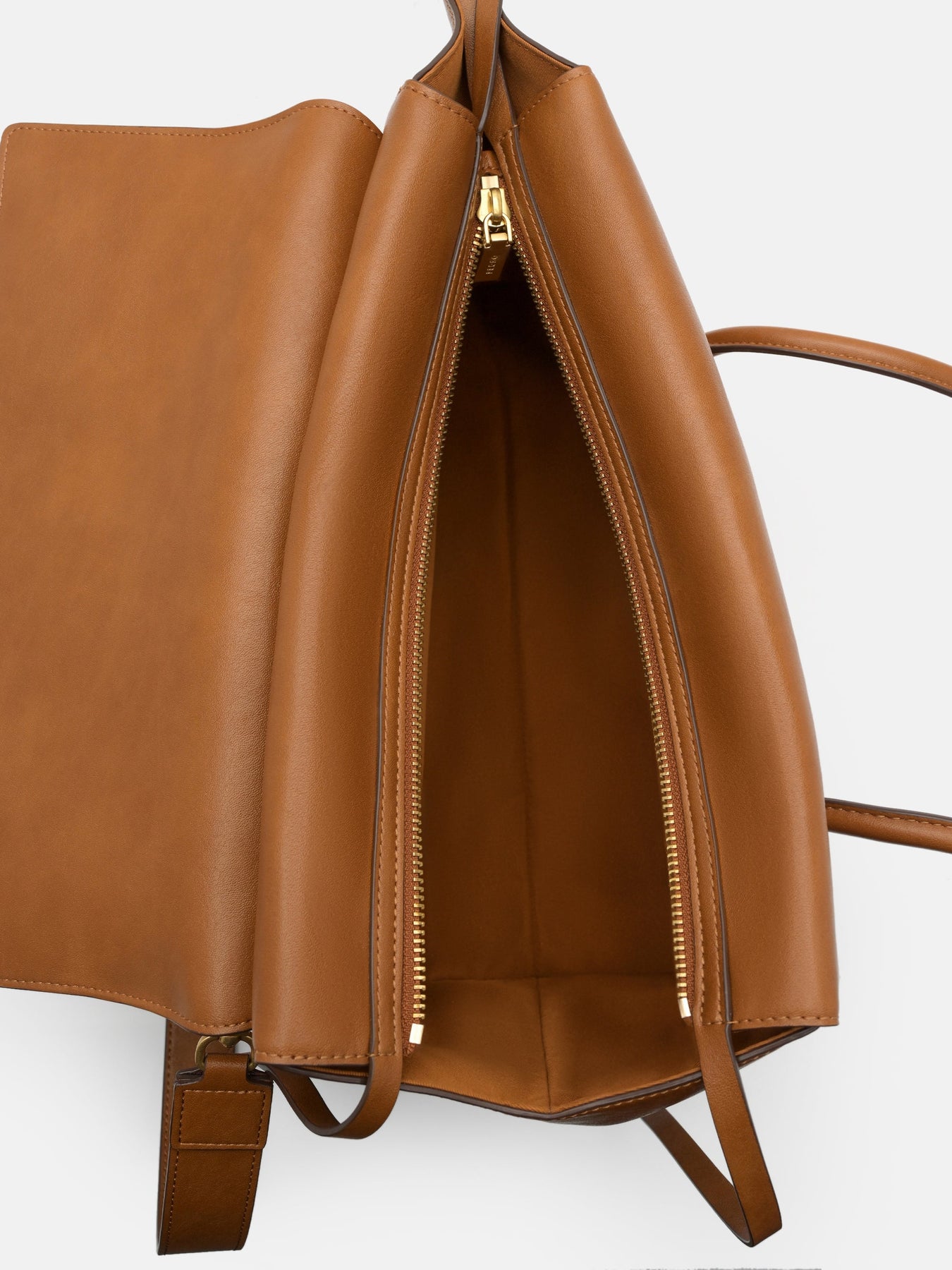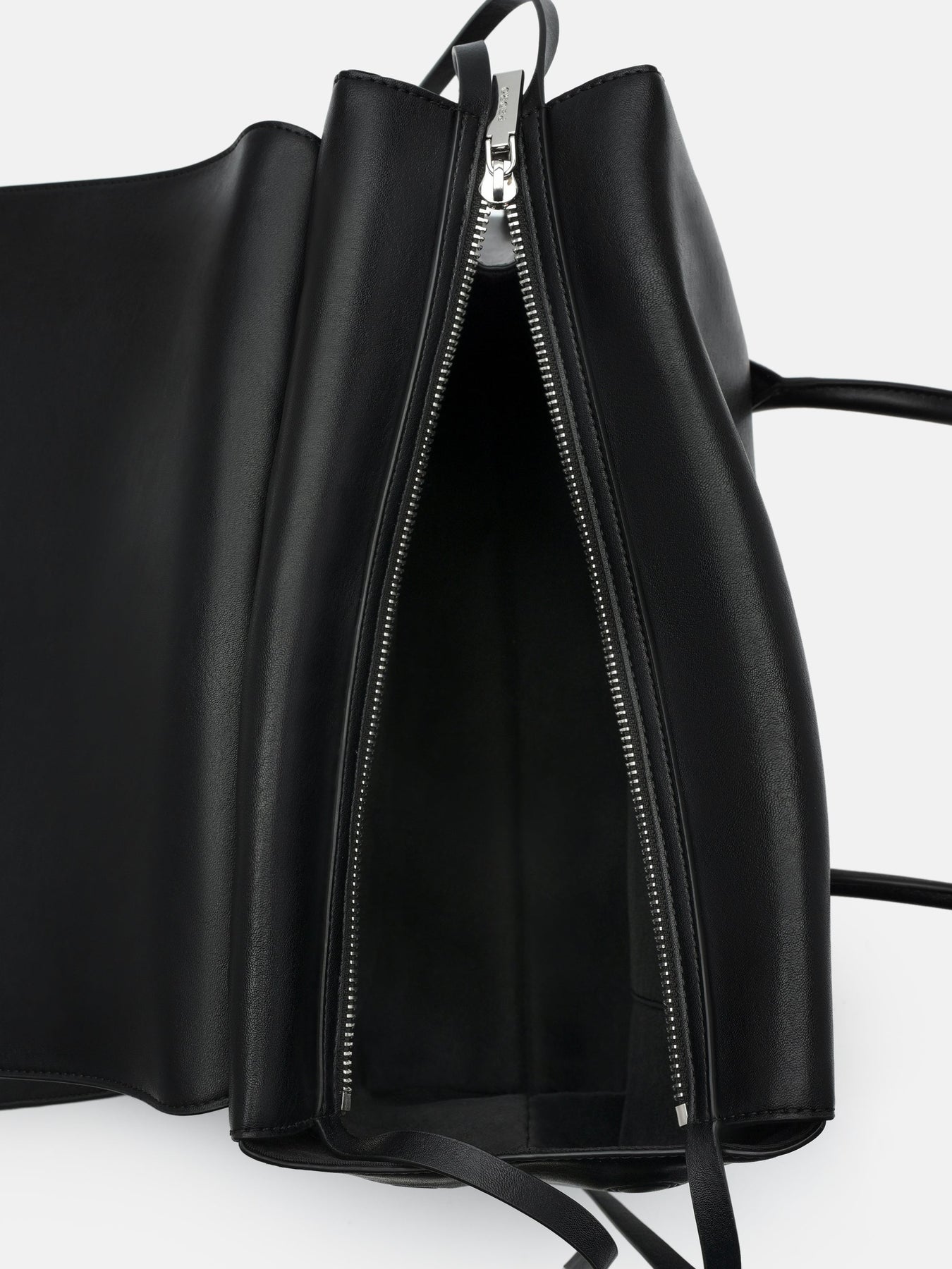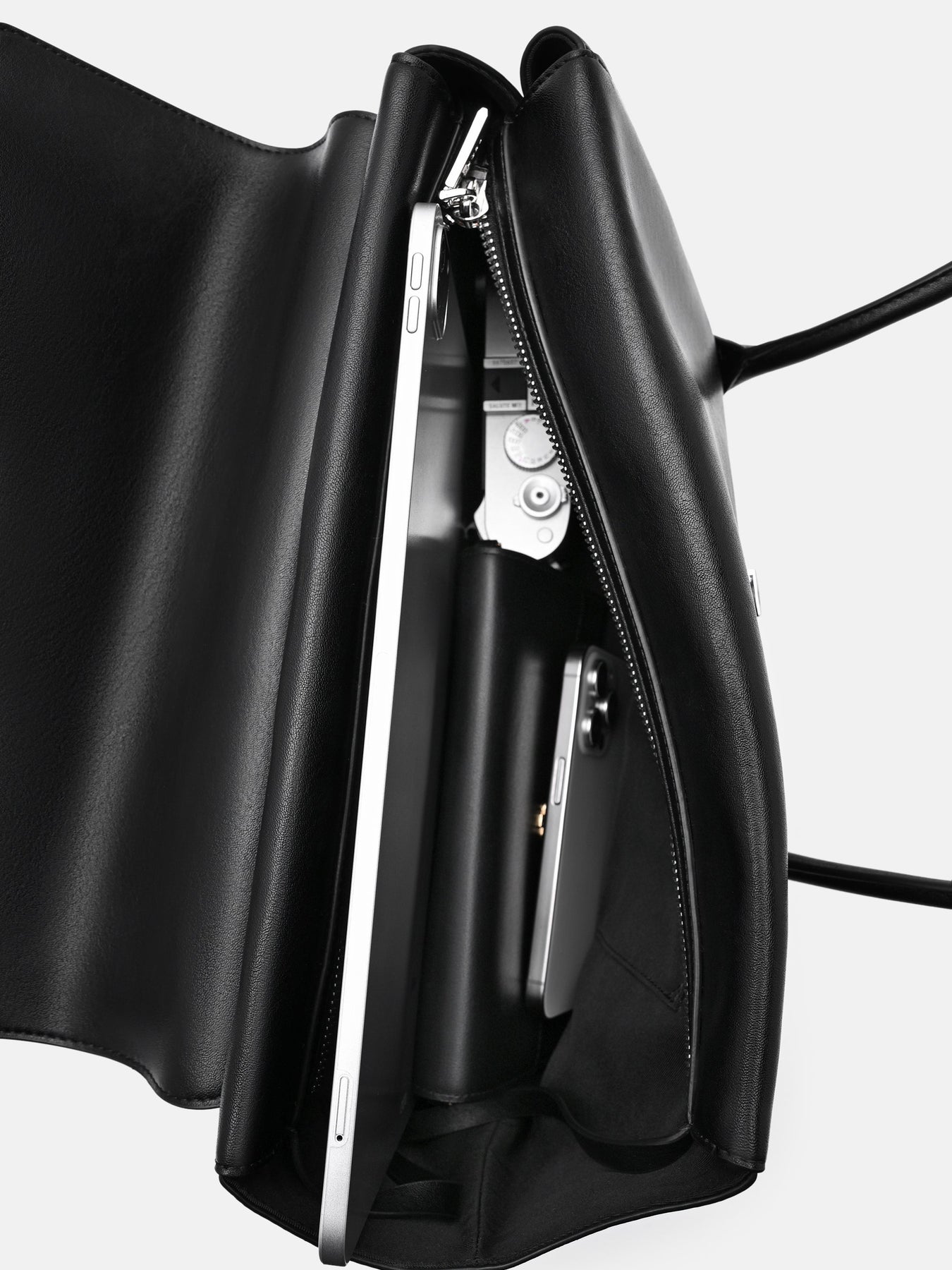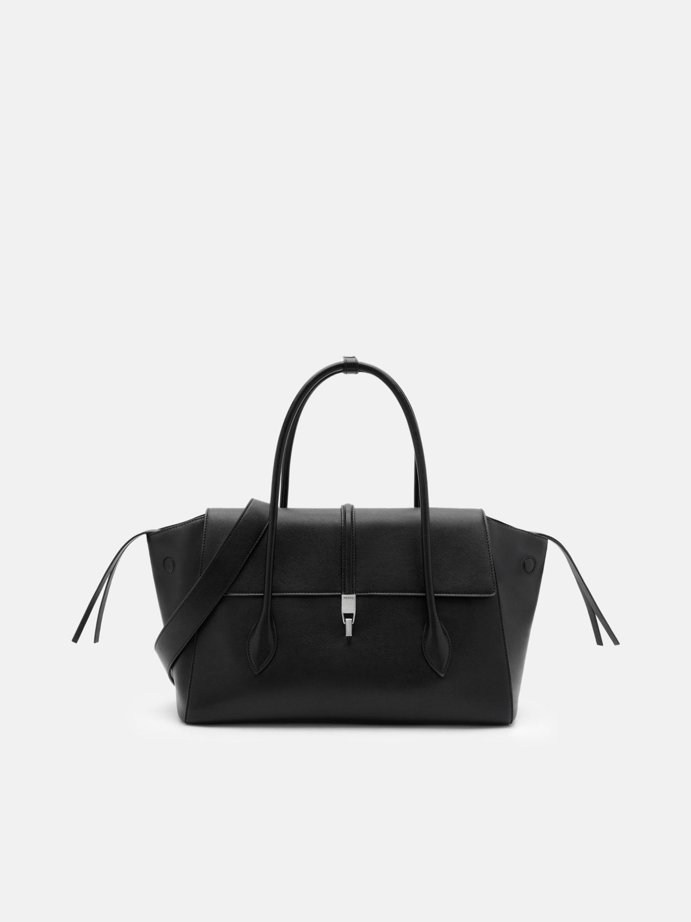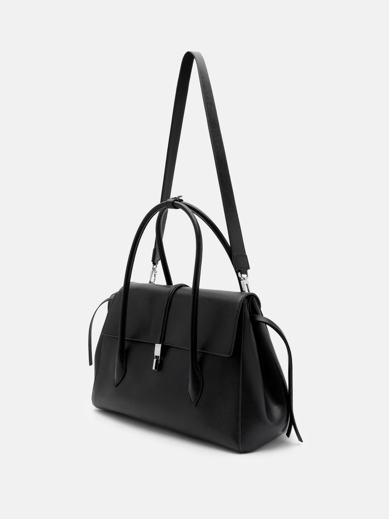 Structured yet fluid, this bag shifts with intention, its sides tucking in to reveal distinct silhouettes. An envelope flap frames subtle hardware and a turnlock closure, while a removable shoulder strap allows effortless transition between hand-held refinement and relaxed, modern ease.