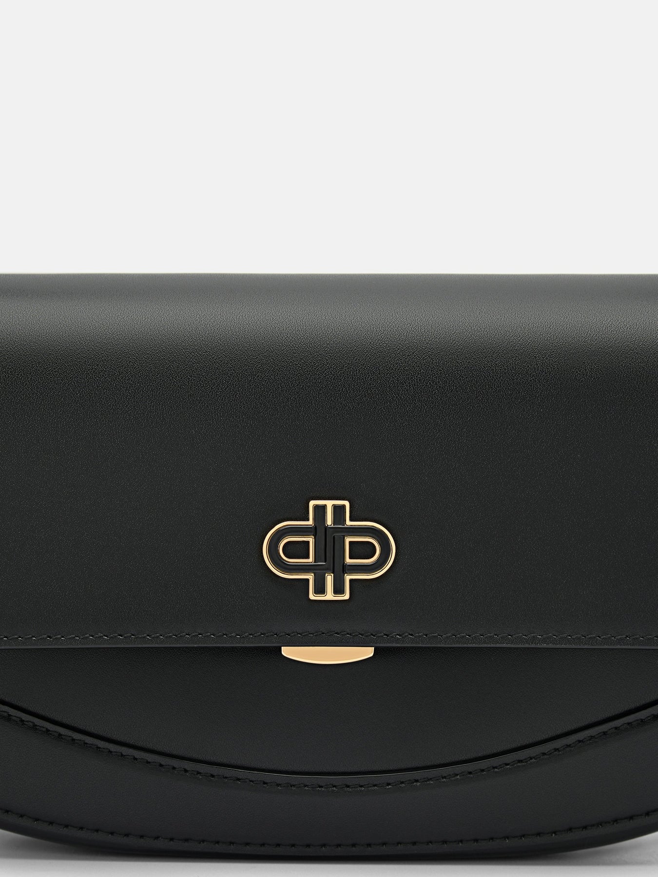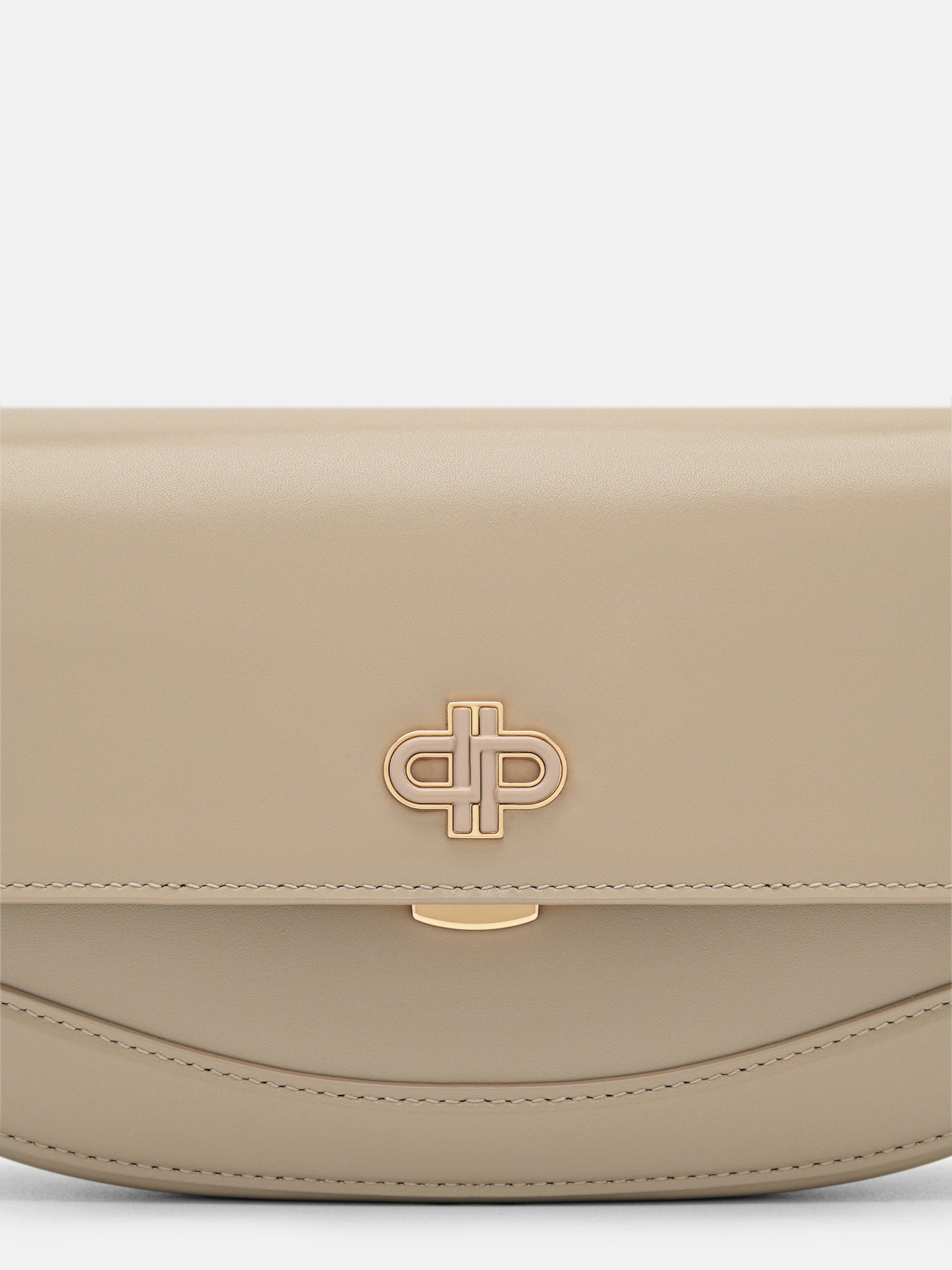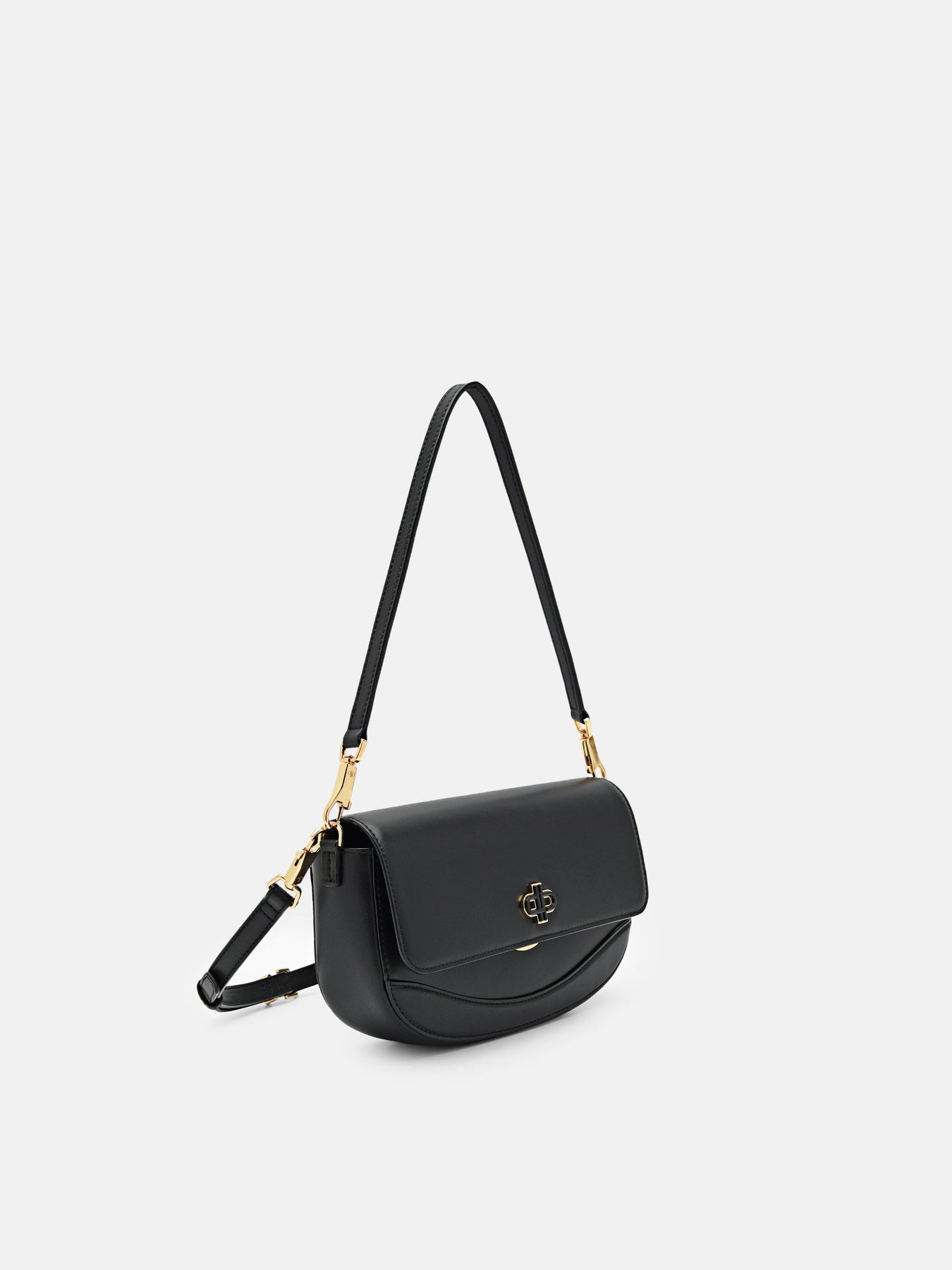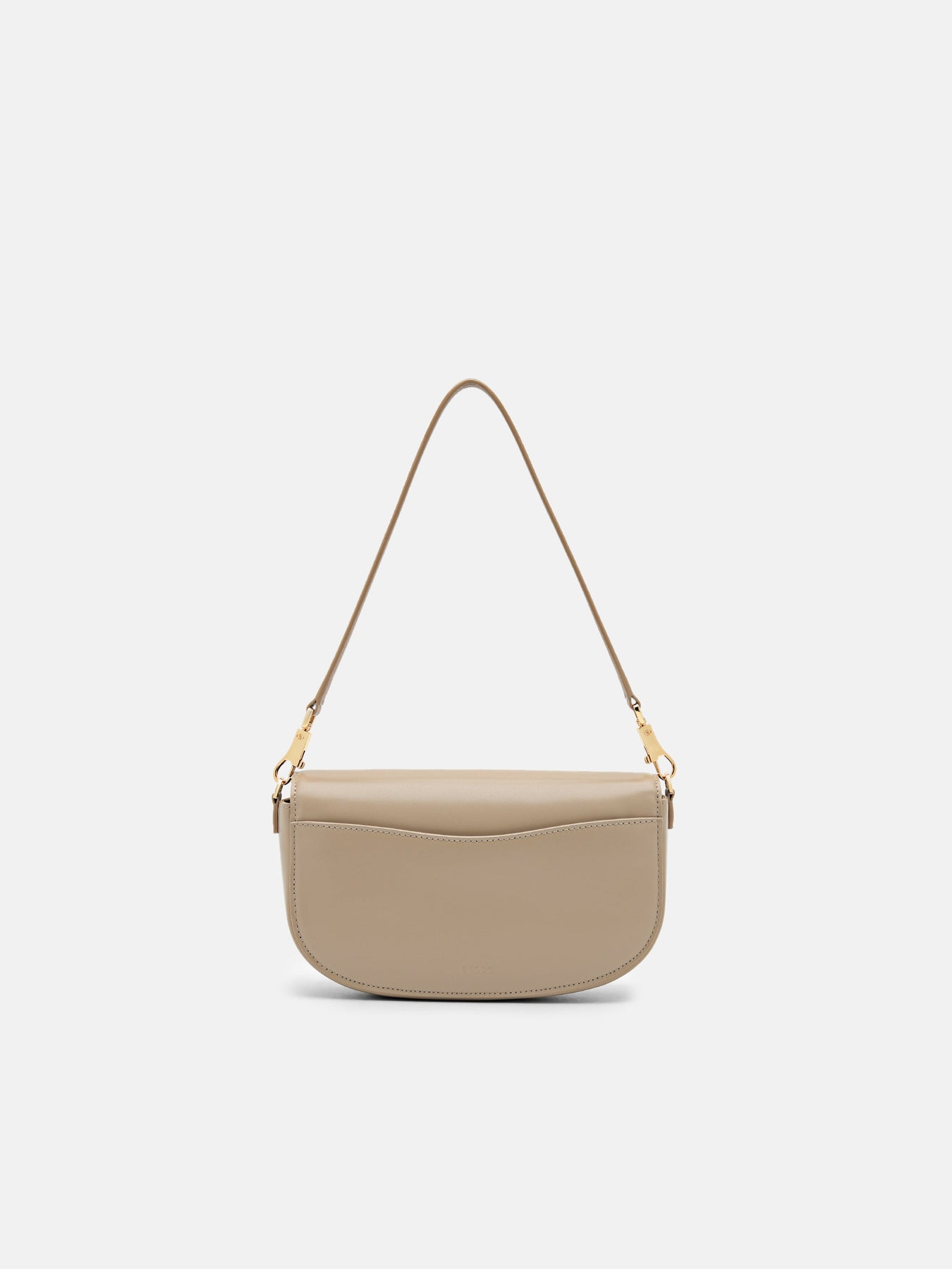 The Leather Shoulder Bag brings structure and softness into sharp balance. Its rounded silhouette is defined by a clean top flap and finished with tonal monogram detailing that whispers branding rather than shouts it. Crafted from calf leather and accented with gold-tone hardware, the bag balances classic codes with a contemporary lens.