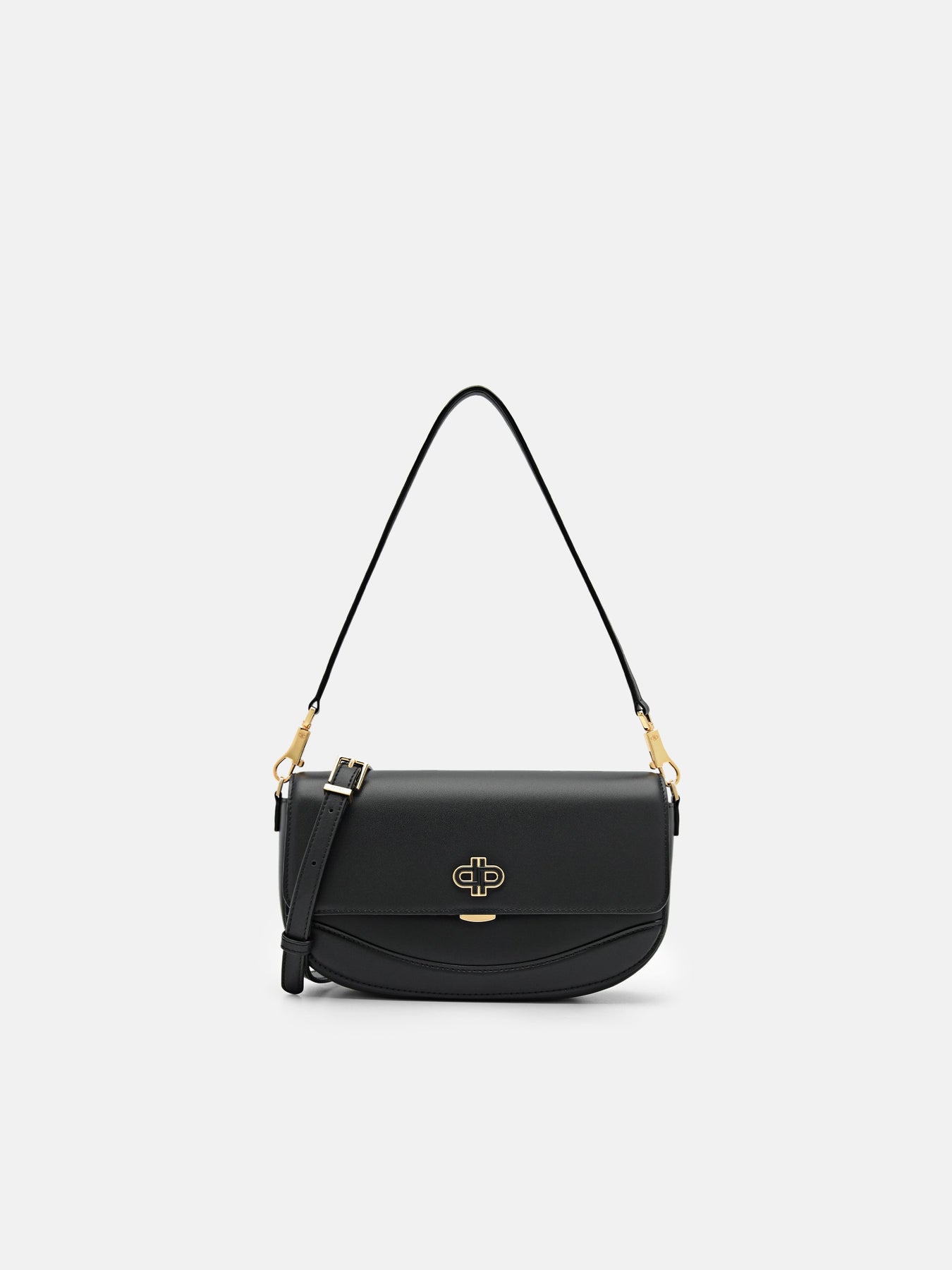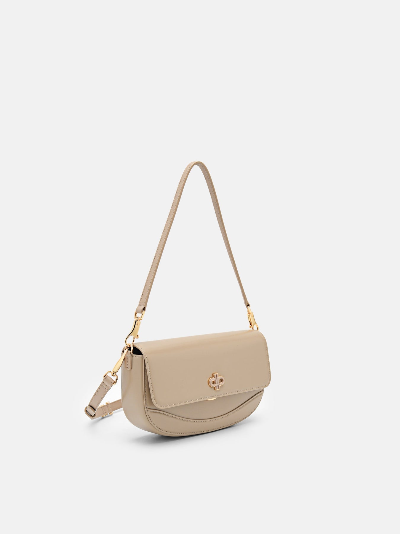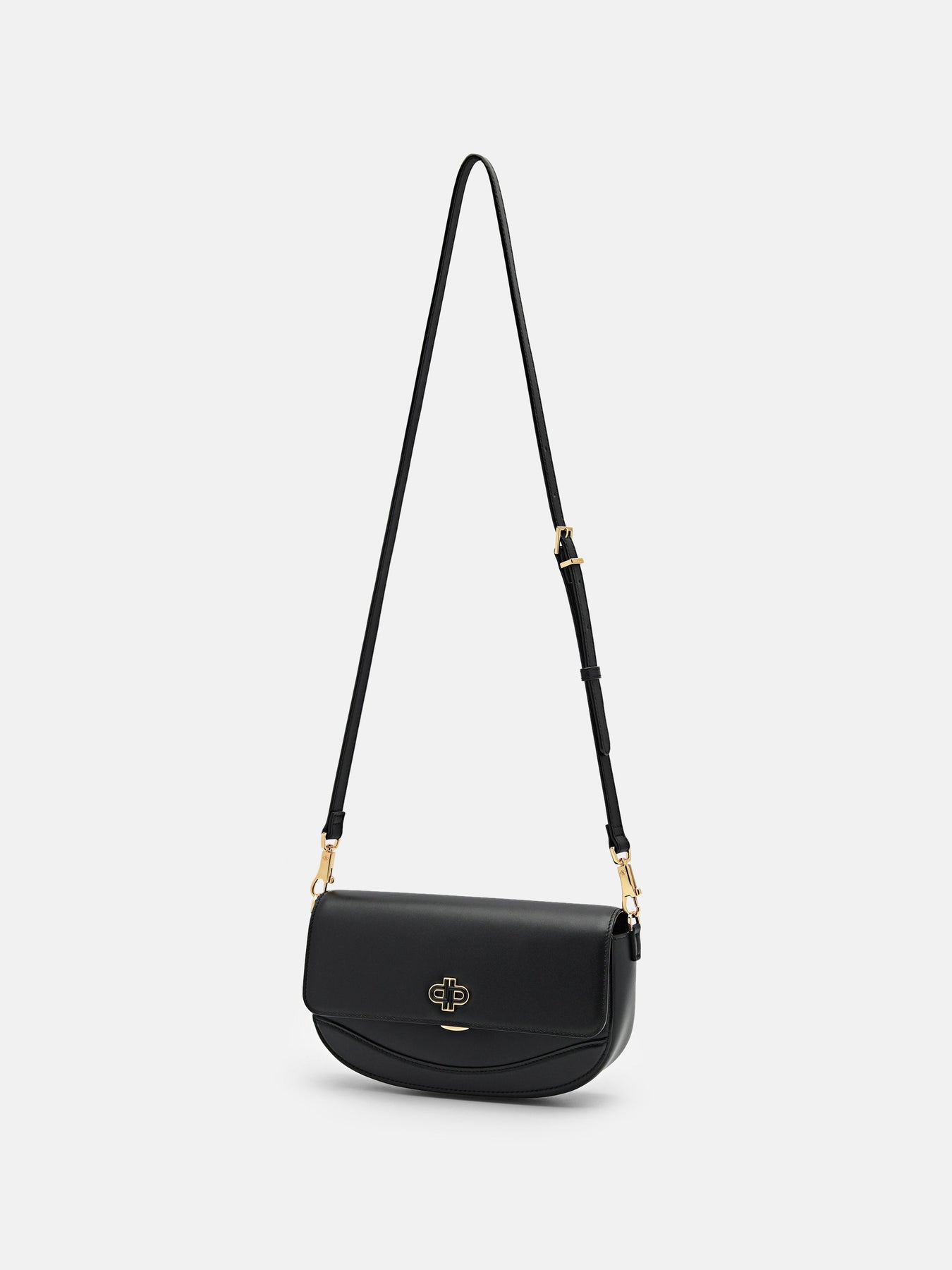 The Leather Shoulder Bag brings structure and softness into sharp balance. Its rounded silhouette is defined by a clean top flap and finished with tonal monogram detailing that whispers branding rather than shouts it. Crafted from calf leather and accented with gold-tone hardware, the bag balances classic codes with a contemporary lens.
