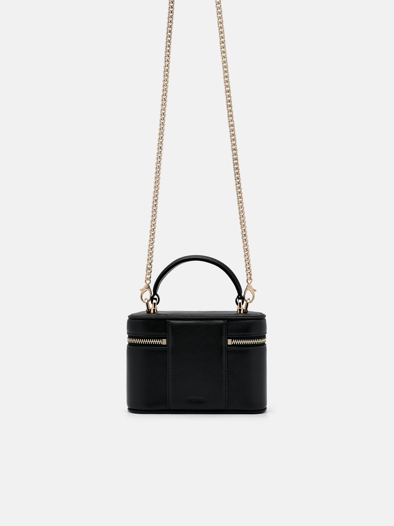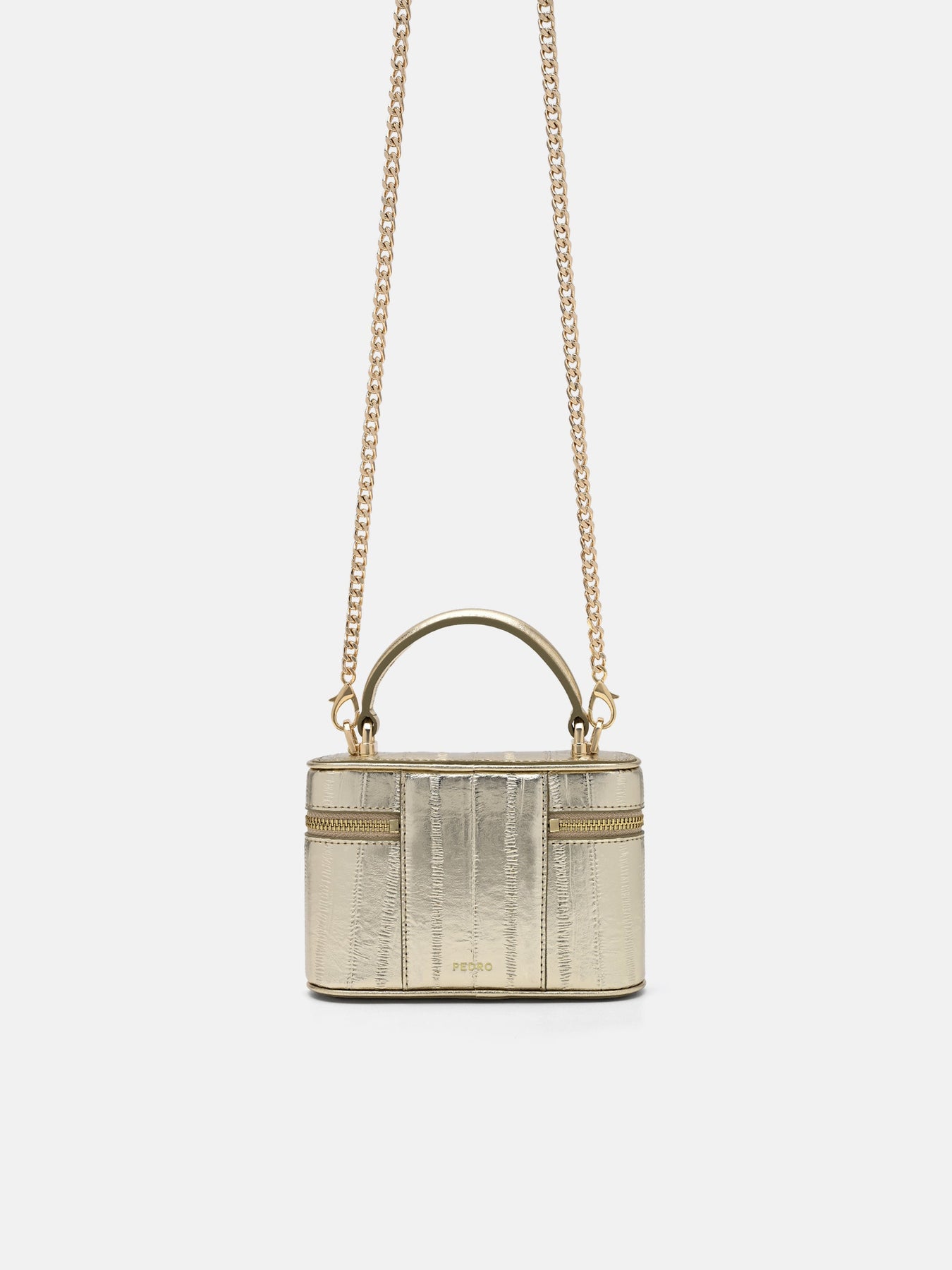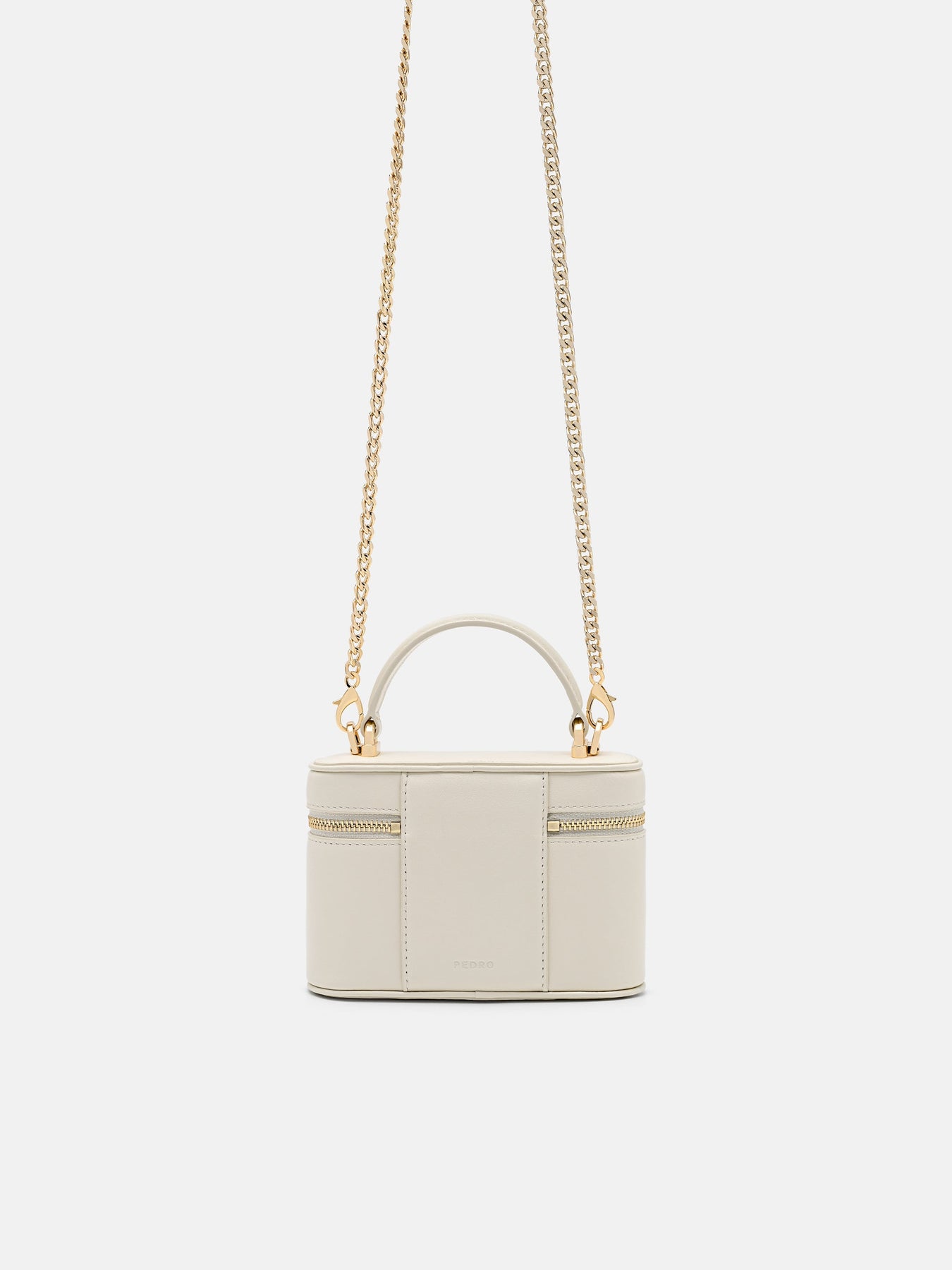 Regular price $69.90Crafted from supple calf leather, this vanity case combines structured construction with effortless functionality. Its zip-around design opens to a thoughtfully organized interior, while a detachable chainlink wristlet adds versatility for on-the-go styling.